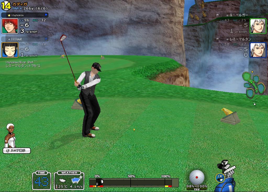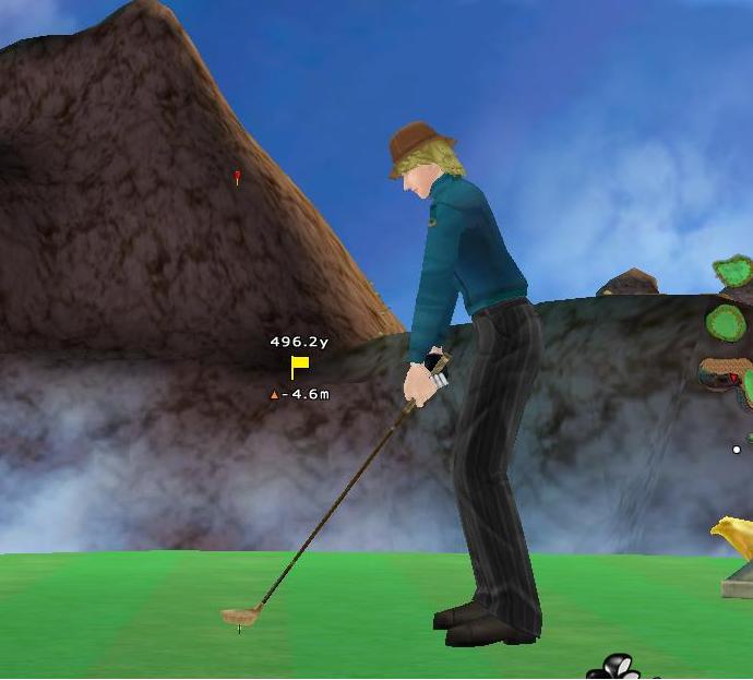 レベルがあがると前の岩をアイアンで超えていくらしいですけど、私には、まだ3Wでも届きません。1wでは方向が合いませんし、右に打つしかないんですが、右からですとセカンドが3Wになります。