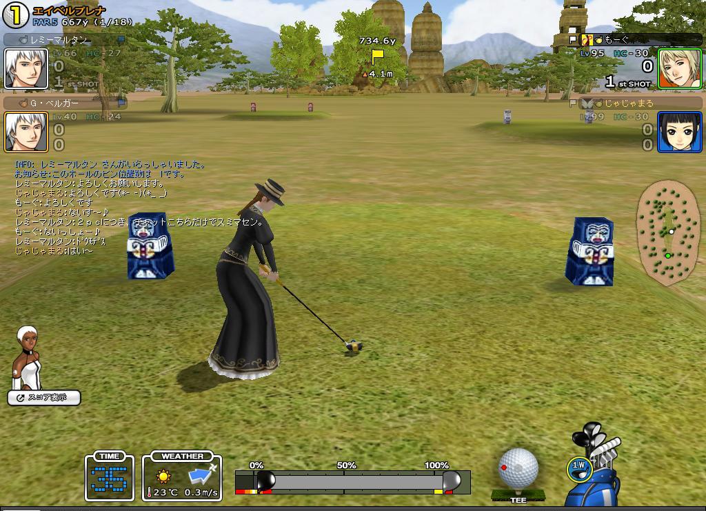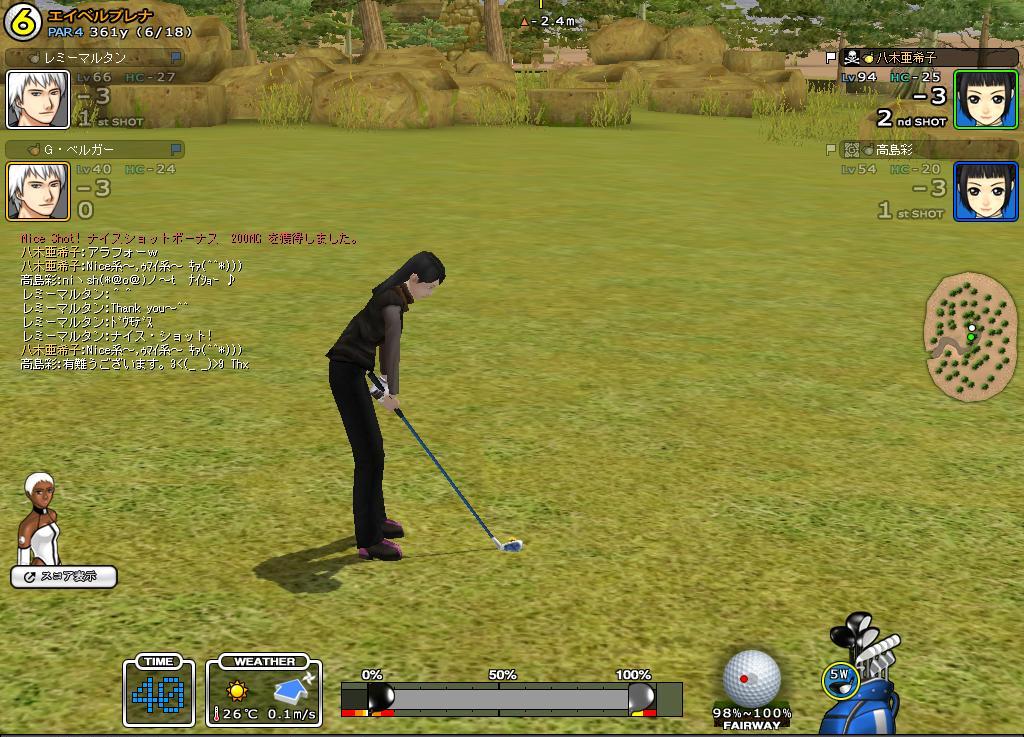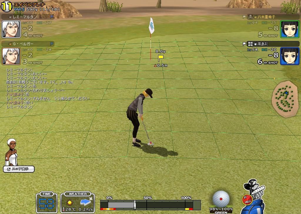 7H目ぐらいまでは、何とかー5でくらいついて行きましたが、その後は未だエイベル不慣れな部分がでてしまい、池にいれたり林にいれたりと、てんやわんや状態。八木さんと高島さんに迷惑かけっぱなしです。