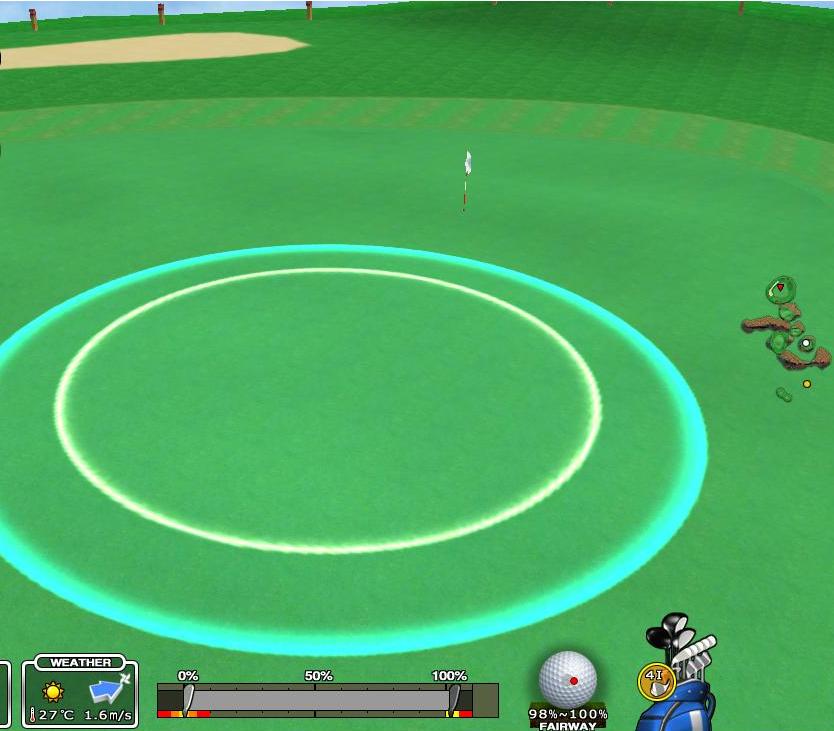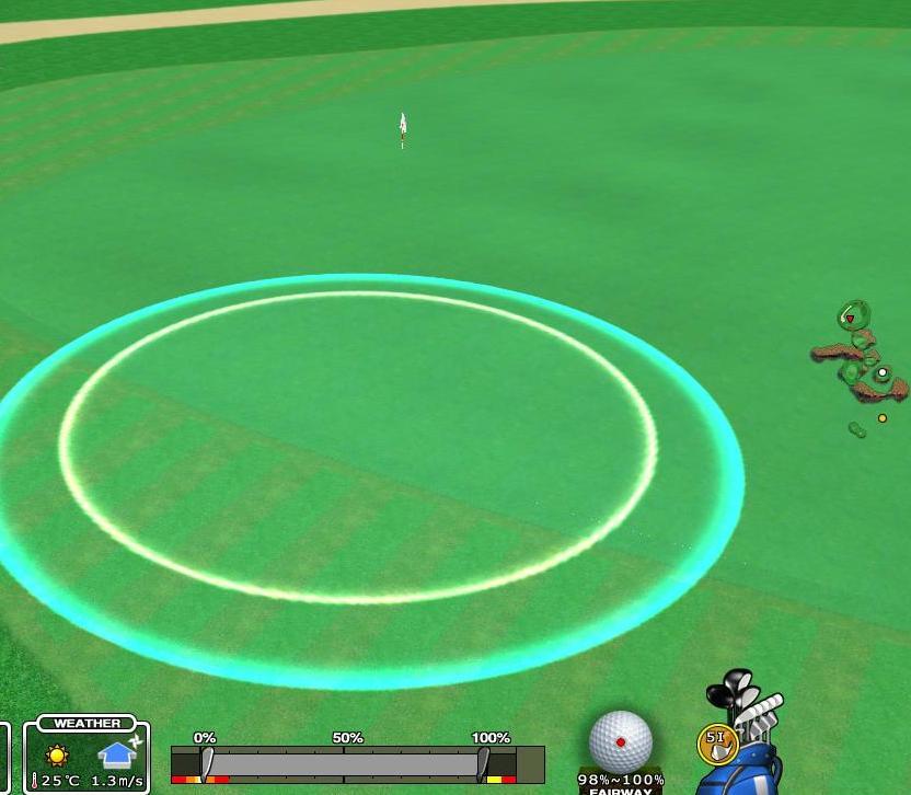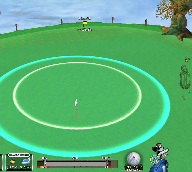 これより左に打つと木に当たりますから、私はラウンド中いつも 先ずストレートでこの目印にサークルを合わせて、その後打点をいじってスライスで右のFWを狙っています。