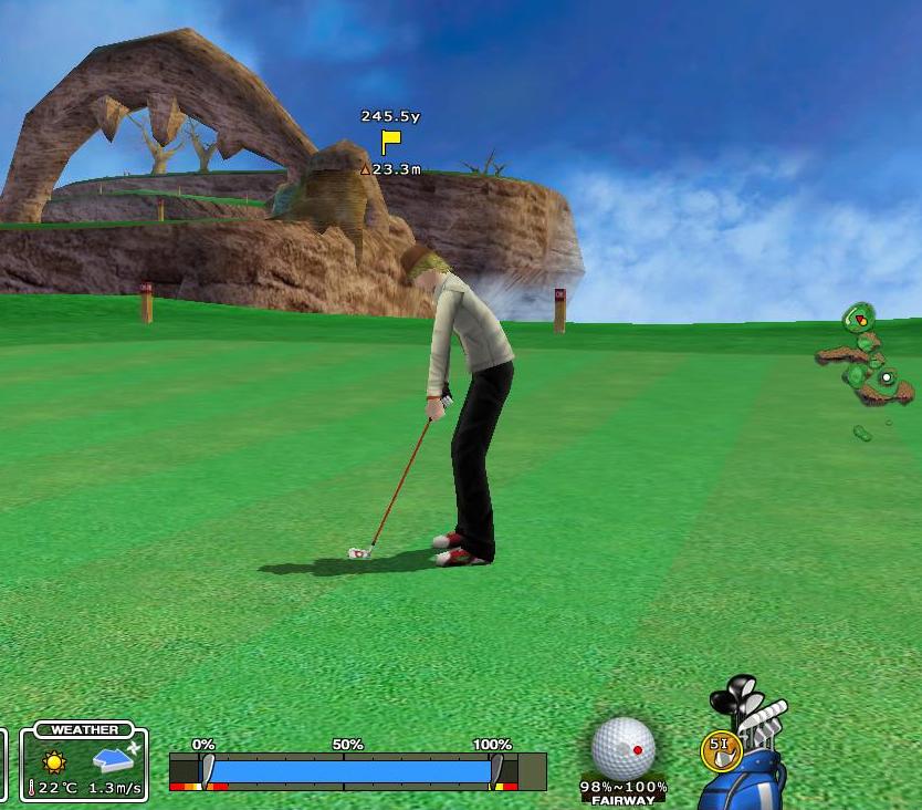 ここで悪天や強風の時は、私は距離表を使うことにしています。島の中央少し奥のベスポジ地点まで距離は248yになりますから、その地点に置けるように慎重にうっています。